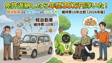 免許返納・基礎知識 免許返納したら年間35万円浮いた!軽自動車 vs タクシー vs シニアカー 維持費10年比較【2026年版】 免許返納で年間35万円浮く!? 軽自動車、タクシー、シニアカーの10年維持費を徹底比較!車維持は年42万円、タクシーは年24万円。シニアカーなら約5万円!車検代や保険を見直して、賢く節約しませんか? 2026.02.03 免許返納・基礎知識
