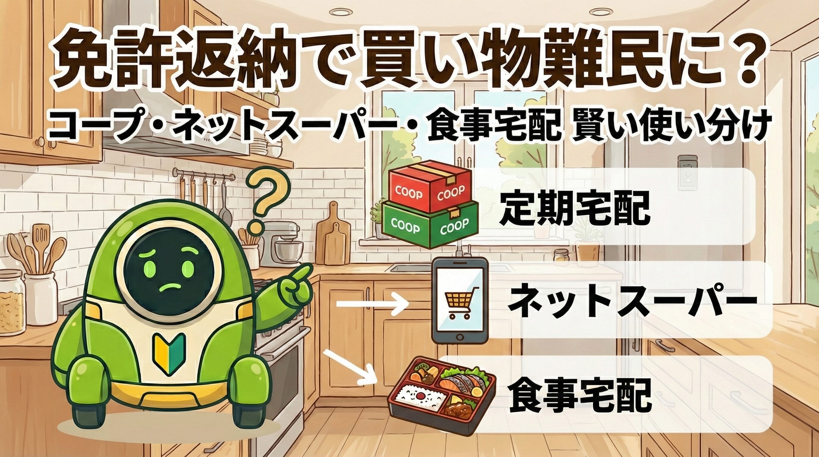 おっしゃる通りです、パパさん!免許返納は、そのまま放っておくと「買い物難民」への入り口になりかねません。でも大丈夫。今は便利なサービスがたくさんあります。感情論ではなく、コスト、手間、親御さんのITスキルなどを客観的に比較して、最適な『食のインフラ』を整えましょう!