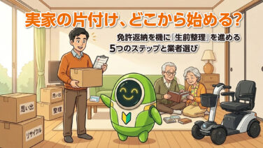 親の免許返納を機に実家を片付けたいが、どこから?親を傷つけずに進める「生前整理」の魔法の言葉、5ステップ、失敗しない業者選びを解説。快適な老後のために今すぐ始めましょう。
